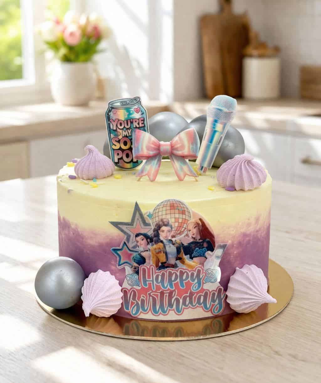 Torta potiahnutá dvojfarebným krémom, zdobená pusinkami a jedlou oblátkou.