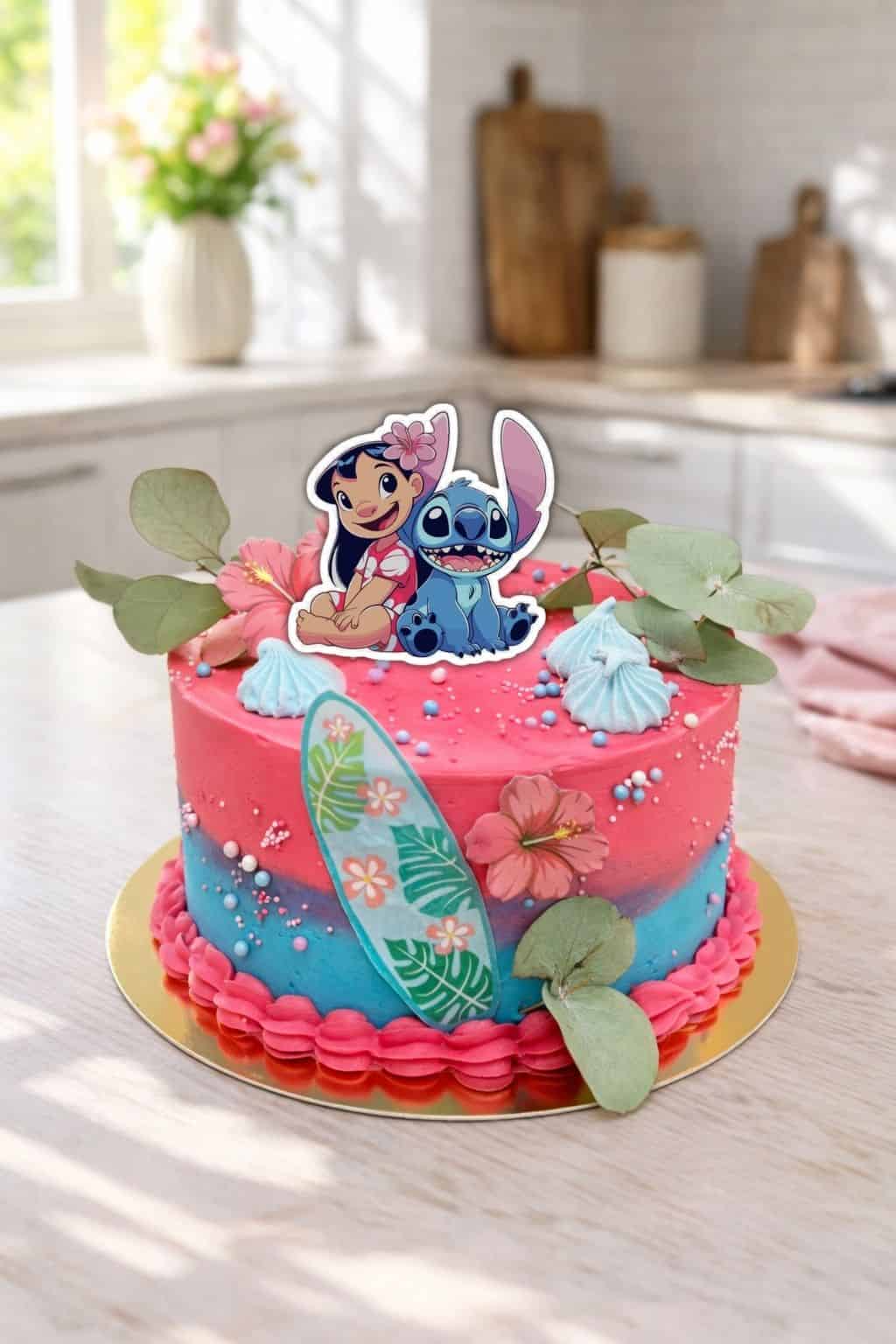Torta potiahnutá modro ružovým krémom, zdobená pusinkami a jedlou oblátkou.