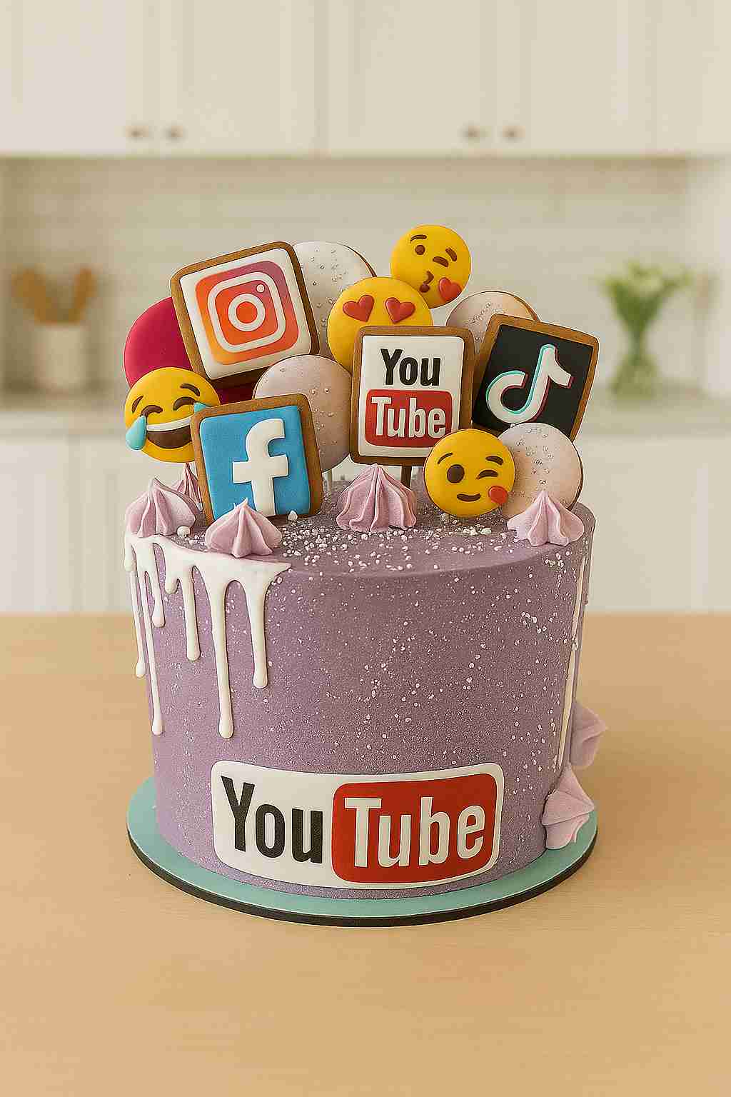 Fialový krémová torta pre všetky instamaniačky s ikonami sociálnych sietí a smajlíkmi z perníkov.