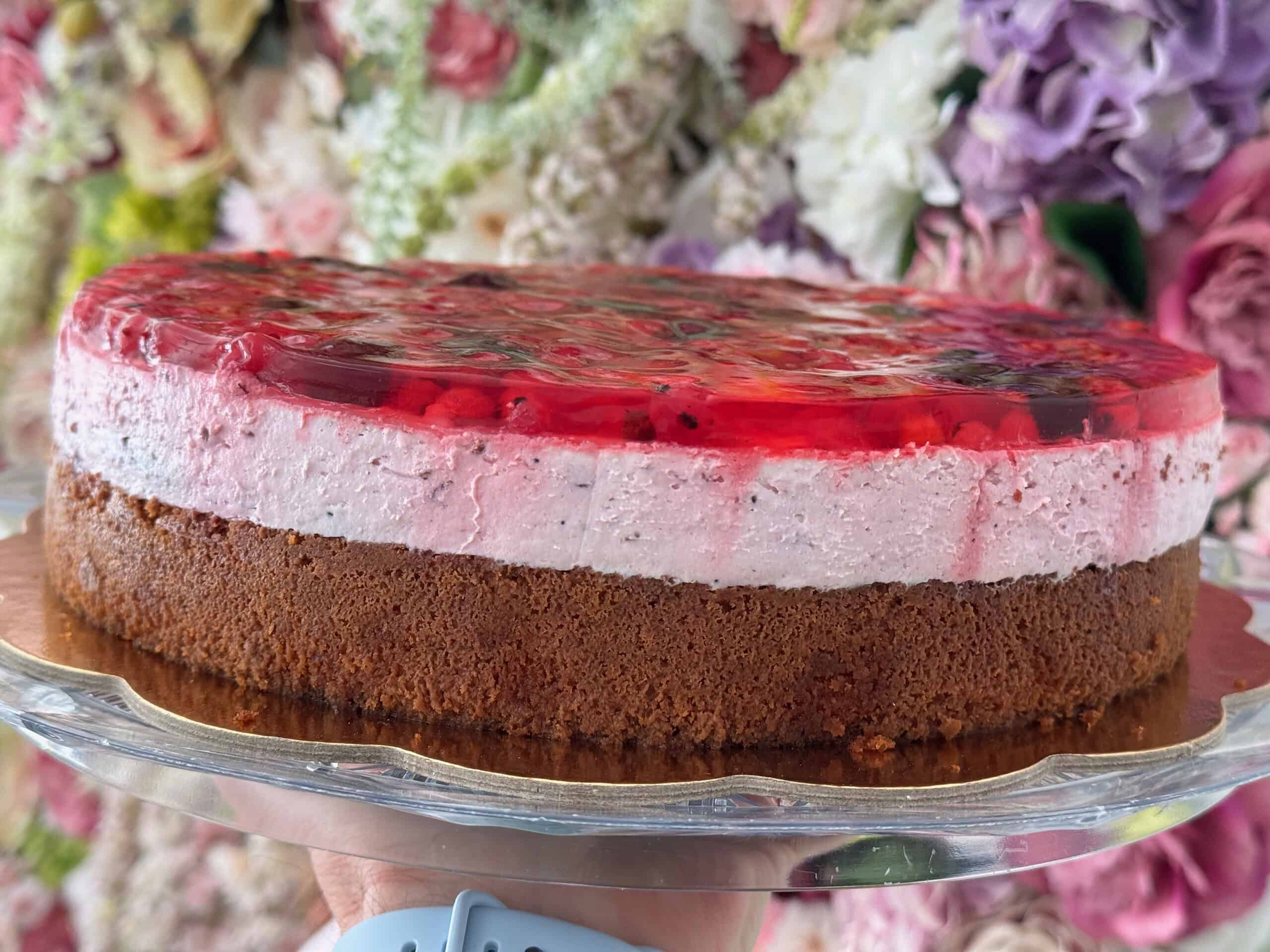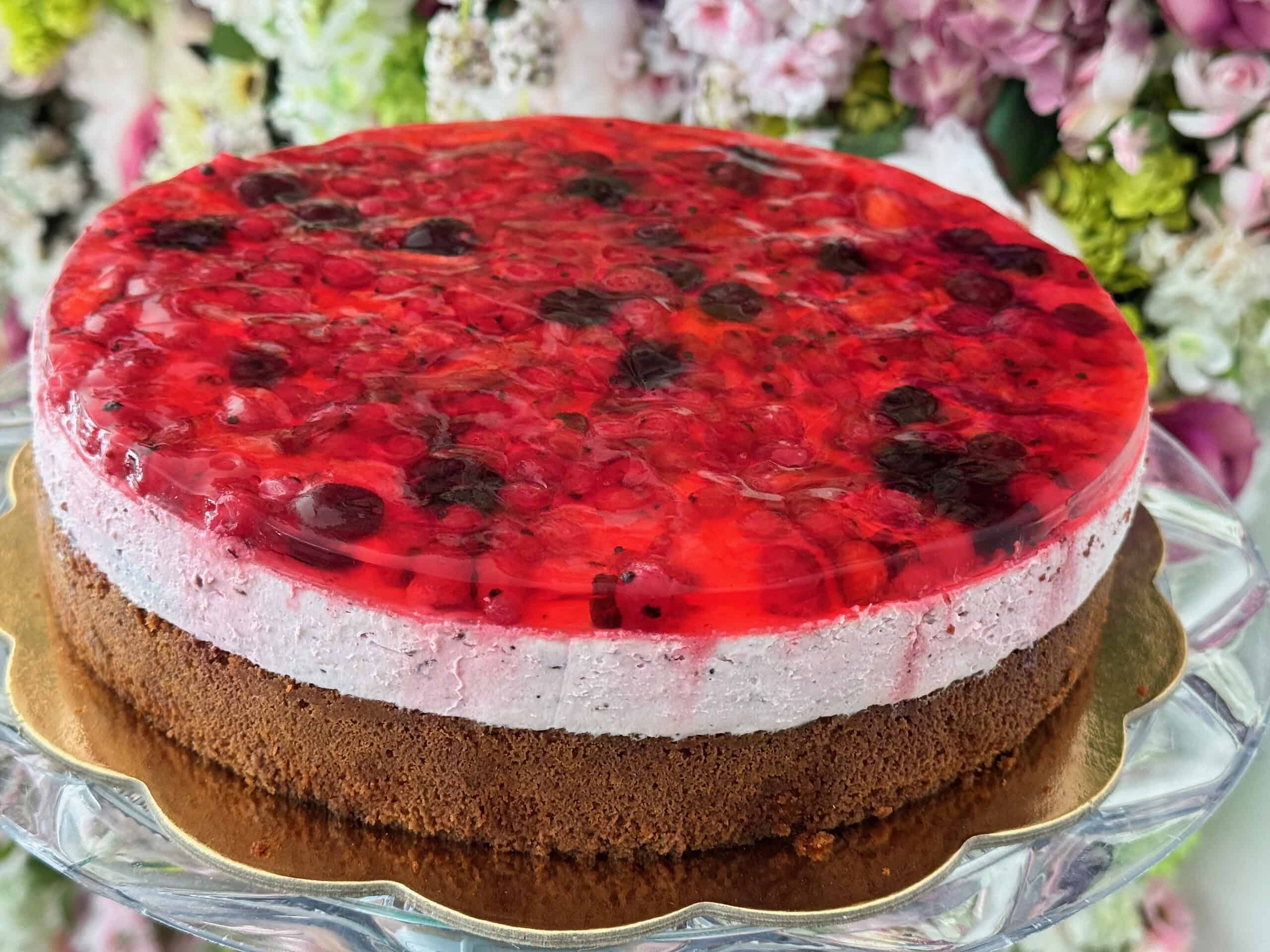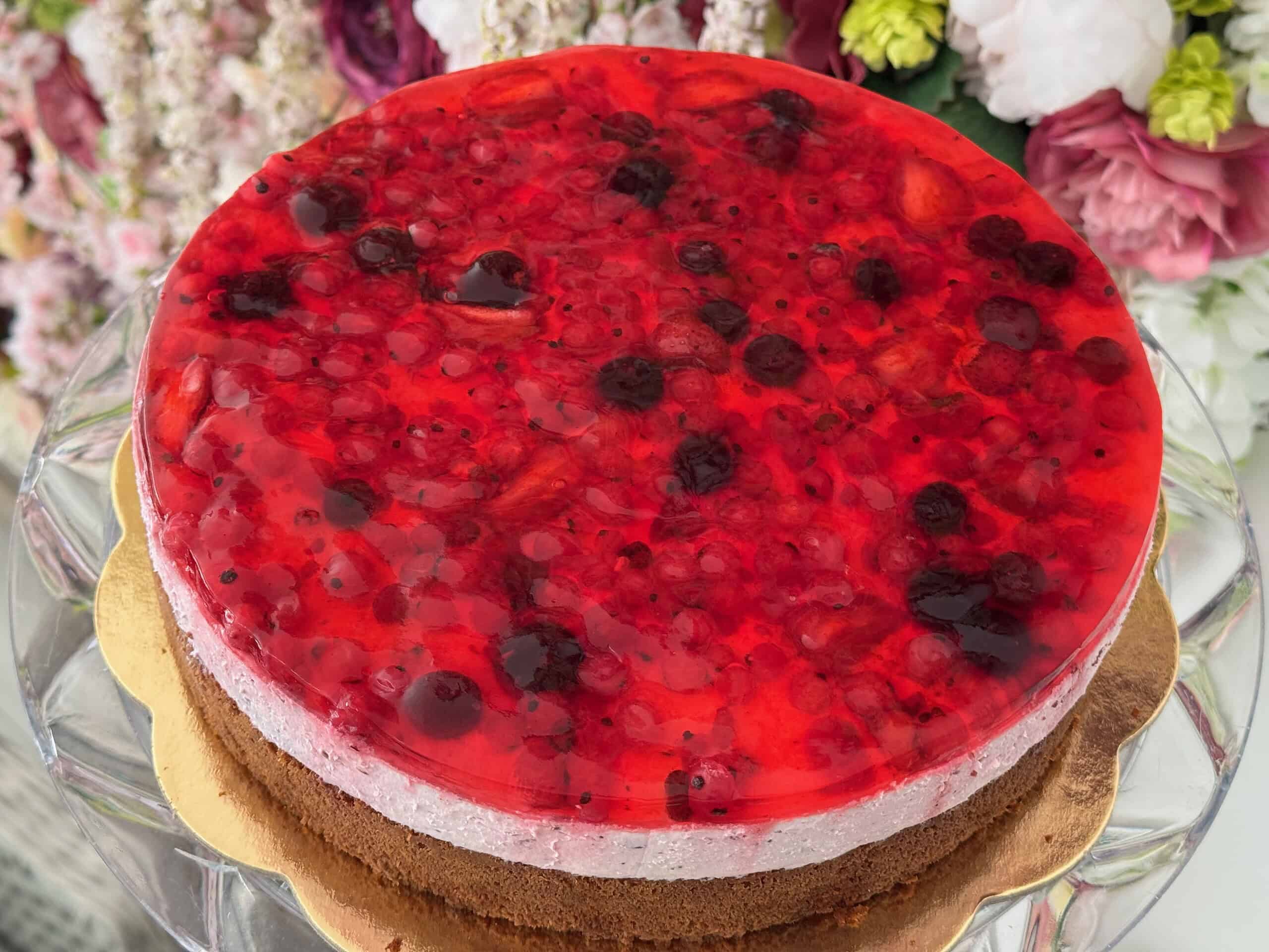 Želé torta s mixom ovocia – jemný vanilkový korpus, mascarpone smotanový krém s mixom ovocia a na vrchu torty mix ovocia v želatíne. Možnosť objednať aj bez lepku a bez laktózy.